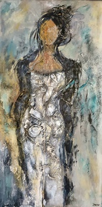 2025Vrouw, acryl, abstract, zwart, bruin, roest, okergeel, wit.