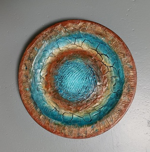 2024Bord, craquelé pasta, acrylverf, roestbruin, aqua-blauw, okergeel, oranje.